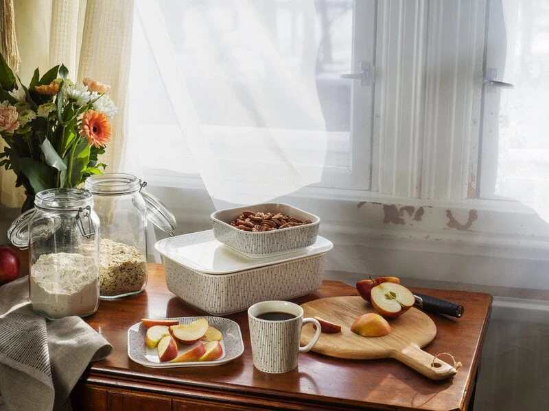 The Mainio Sarastus tableware collection is designed to bring beauty and practicality especially to small kitchens and urban homes. The most essential elements in its product design were versatility, durability and stackability: besides dining, the ceramic tableware is designed for preparing and storing food, and the plates can be used as lids for the bowls or oven dishes.