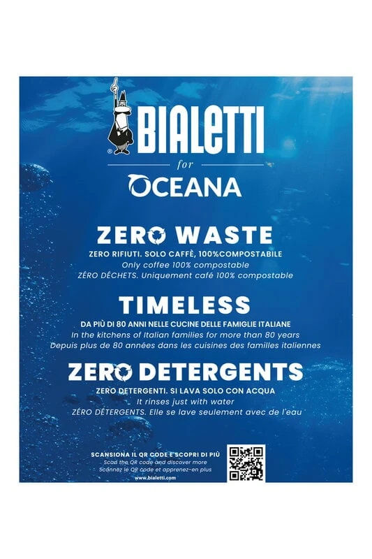 Bialetti’s Moka Express Oceana coffee maker allows you to enjoy your coffee in an authentic Italian way. With the Moka Express Oceana collection, Bialetti supports Oceana, an international organization that works to protect the oceans. The classic moka pot also fits the zero-waste lifestyle, as it produces only compostable waste, only requires washing with water and will serve you for at least a decade. Moka Express is made of aluminium and can be used on all stovetops except induction.