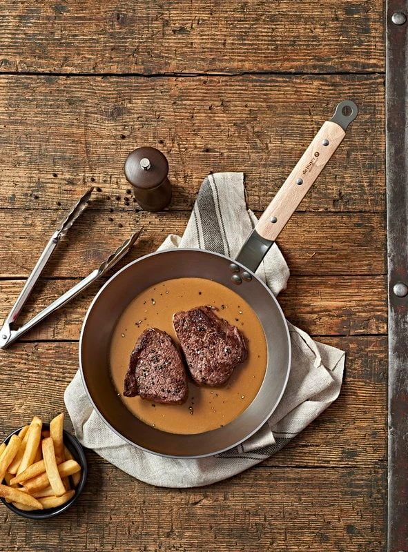 The robust and lightweight carbon steel pans can withstand high temperatures, are excellent for caramelizing food, and stay hot for long. When used regularly, the pan will turn darker and develop a natural non-stick surface – the blacker it gets, the less it sticks. You can also season the pan every now and then. Mineral B Bois pans have been manufactured in France.