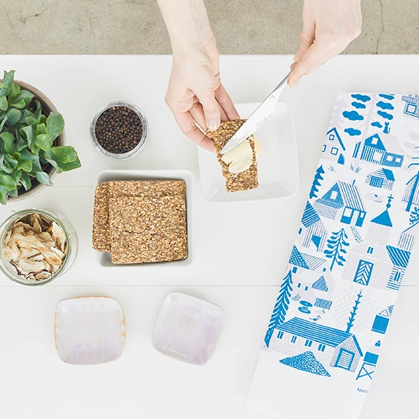 Kauniste’s Mökkilä tea towel features a fun village motif comprising trees and traditional Scandinavian wooden houses, designed by Norwegian illustrator Bjørn Rune Lie. The towel is made from a mix of linen and cotton, and it has a convenient loop for hanging.