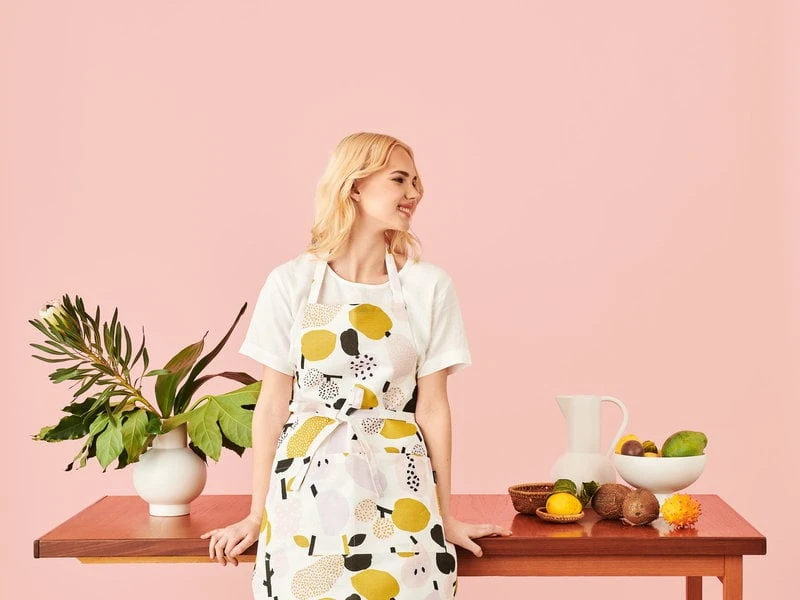 Tutti Frutti apron, designed by Hannele Äijälä for the Finnish Kauniste, is adorned with a delicious pattern of apples, pears, peaches and some tropical and imaginary fruits. The apron has a neck strap and two large front pockets. Tutti Frutti pattern has been silkscreen printed on a durable linen-cotton fabric.